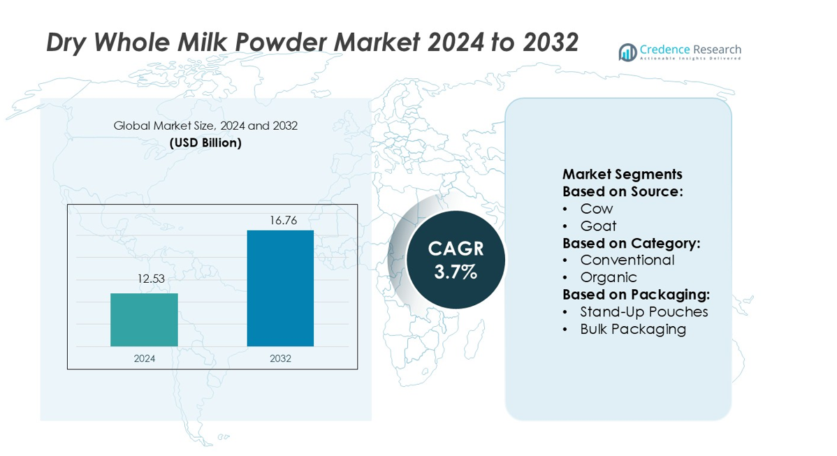 Dry Whole Milk Powder Market size was valued USD 12.53 billion in 2024 and is anticipated to reach USD 16.76 billion by 2032, at a CAGR of 3.7% during the forecast period.
