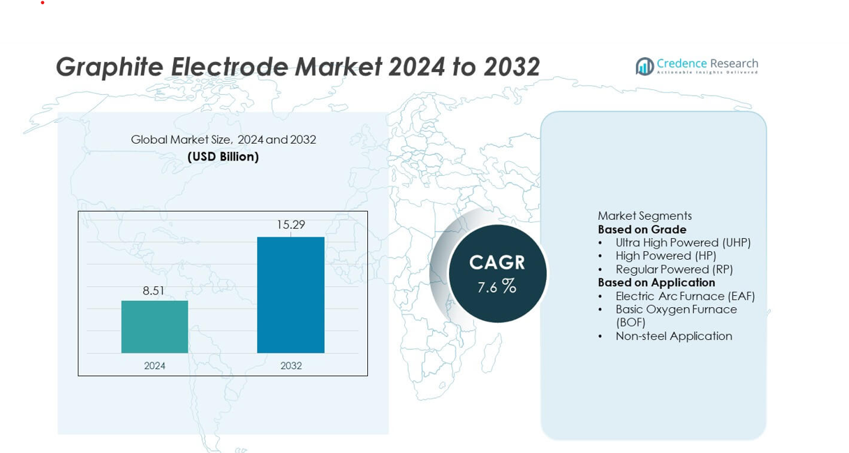 The Graphite Electrode market reached USD 8.51 billion in 2024 and is projected to grow to USD 15.29 billion by 2032, registering a CAGR of 7.6% during the forecast period.